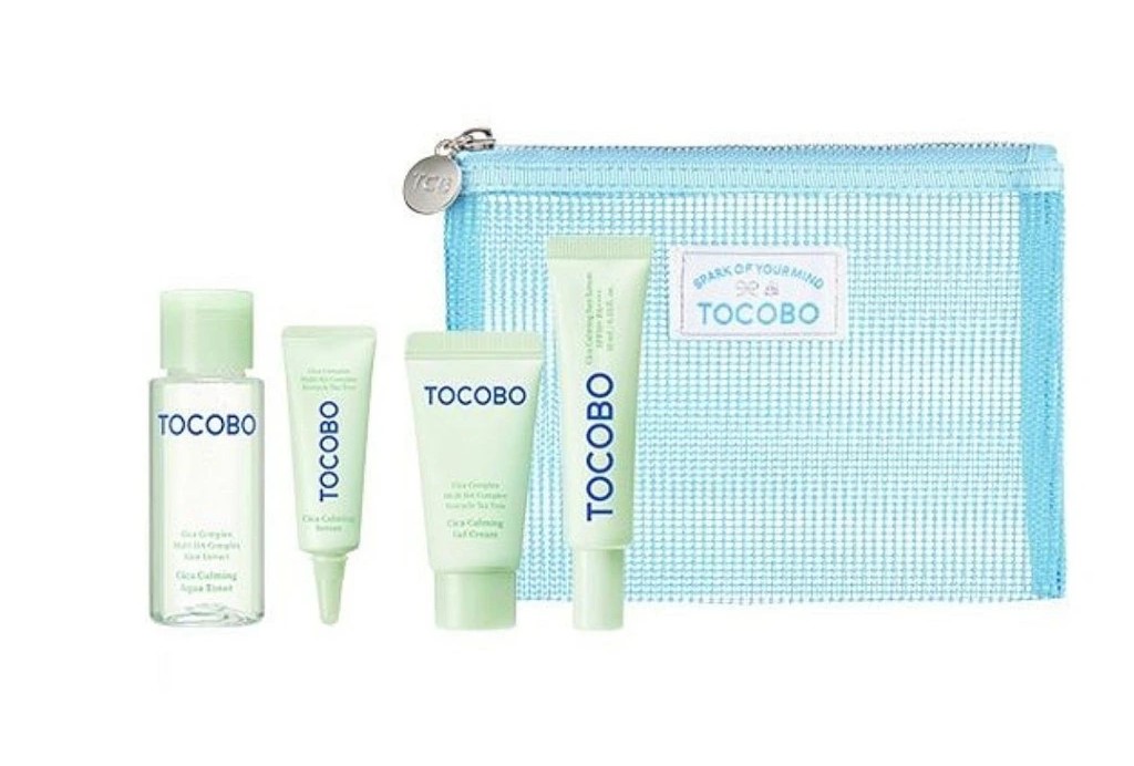 TOCOBO Cica Calming Travel Kit, upokojujúci cestovný set. Táto sada je určená na upokojenie, hydratáciu a ochranu citlivej a podráždenej pokožky